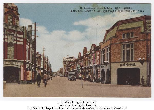 圖片取自中研院開放博物館:(臺北) 榮町街道。典藏者:Lafayette College Libraries。拉法葉學院數位資料使用指南。來源:http://digital.lafayette.edu/collections/eastasia/warner-postcards/wa0215(2021/03/28瀏覽)。