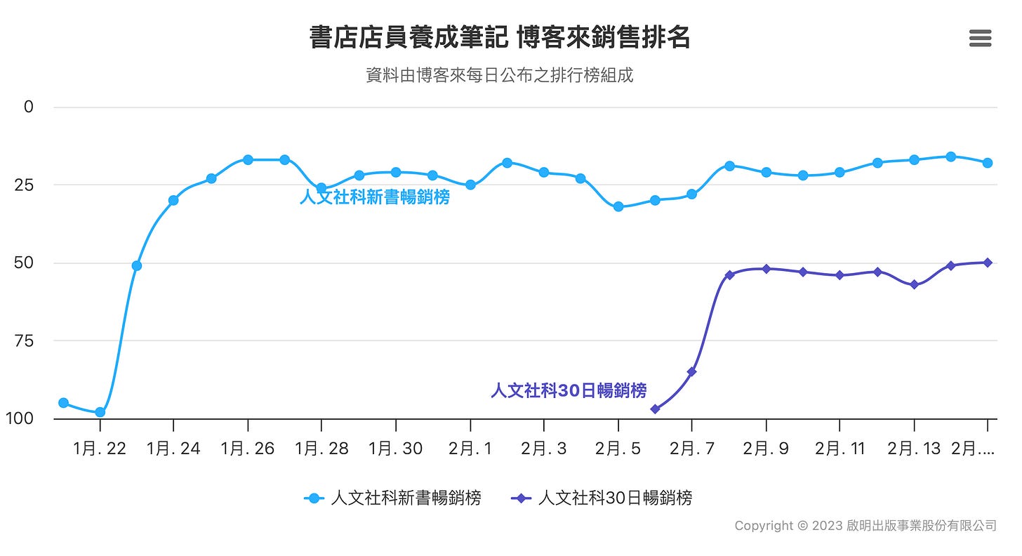 我其實是會「海巡」(或說潛水)的作者,幾乎每天都會搜尋網路上有沒有什麼討論,或是關注通路排行,但無論你信不信,心態上真的像一種實驗觀察:流量轉換成銷售的比例到底如何?甚至嘗試比對出版社提供的週銷量和通路排行之間的關係(雖然討論和銷量的基數都小到很難有參考價值)。此書首批一開始沒有鋪完,但兩週後再刷,對照大通路下量數字看得我滿頭霧水,更深刻體認到要掌握書市的整體情況真的太難。